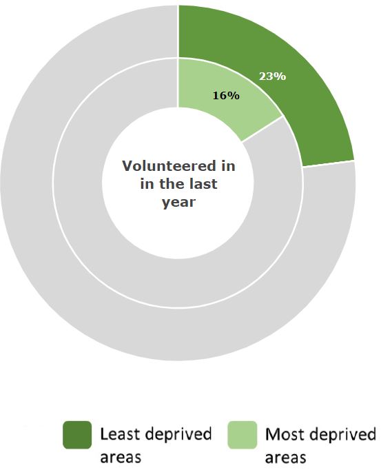 Higher proportions of those who lived in the least deprived areas (23%) volunteered in the last year compared to those who lived in the most deprived areas (16%). Similarly, adults living in a rural area were more likely to volunteer compared to adults living in an urban area (25% and 19% respectively).