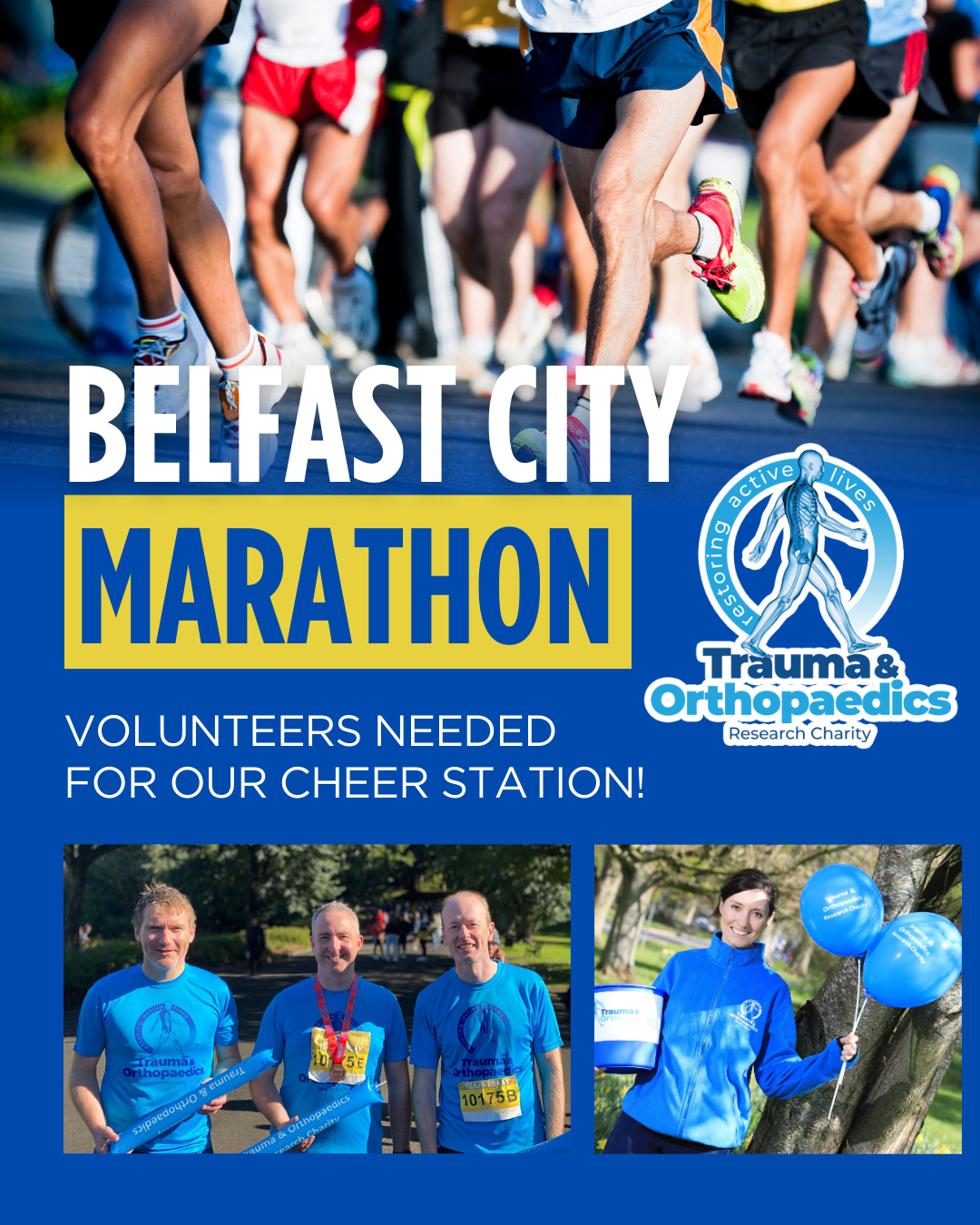 Volunteer to cheer for TORC! On Sunday 4 May 2025, Trauma & Orthopaedics Research Charity are looking for enthusiastic volunteers to join them at their cheer station beside which is along part of the Belfast City Marathon route.