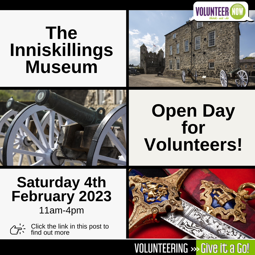 The Inniskillings Museum welcomes you to its Volunteer Recruitment Day on Saturday 4th February 2023. Join their enthusiastic volunteers for an exclusive sneak peek behind the scenes. Discover your passion and meet representatives in each area (History & Learning; Research; Vehicles; Media; Collection & Archives; and Visitor Experience). All volunteers will be provided with training!