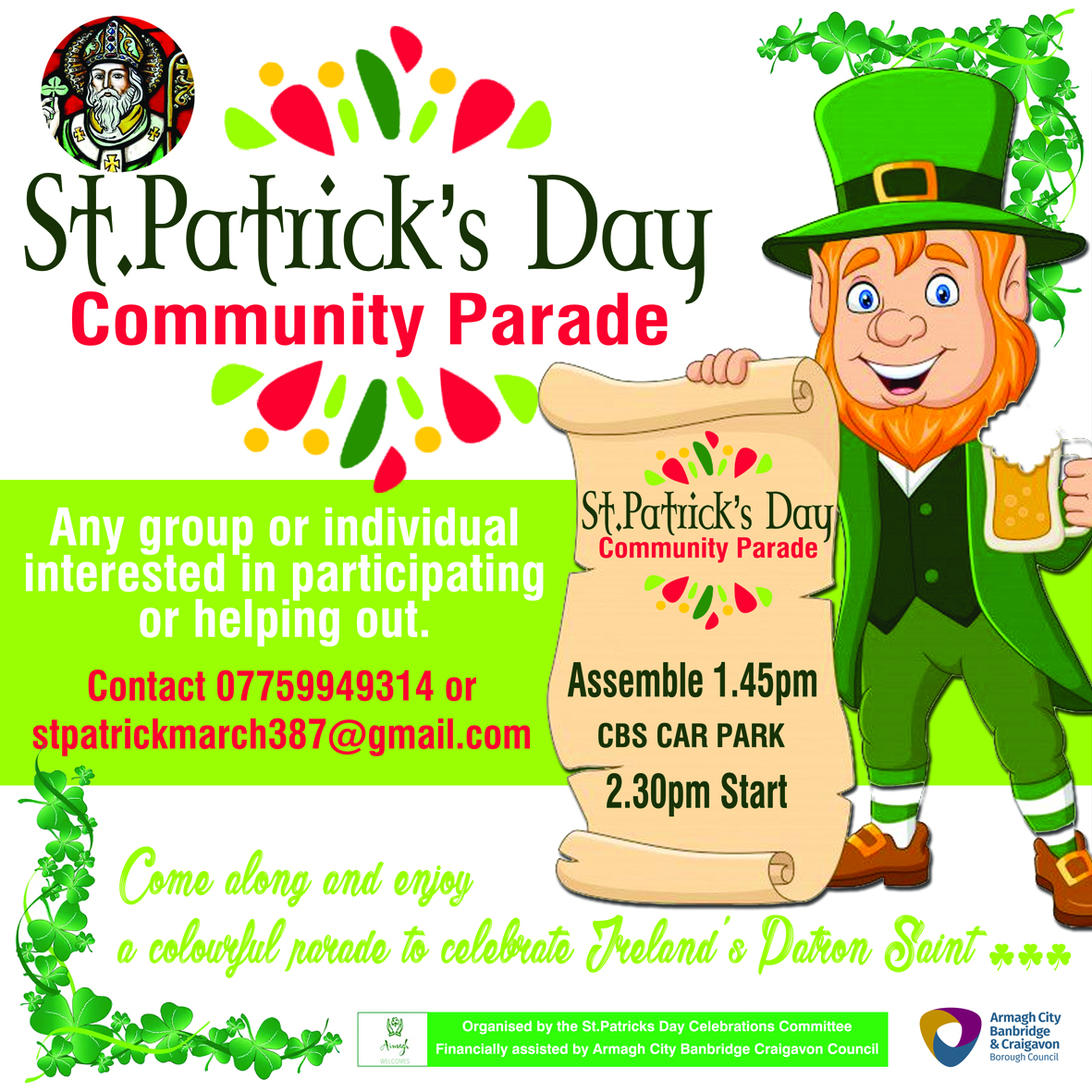 Join the fun at Armagh’s biggest parade! Volunteers are needed to help out with the St Patrick’s Day parade on the afternoon of 17 March and man the route. (There will be a meeting on 13 March to assign roles, so please apply before then)