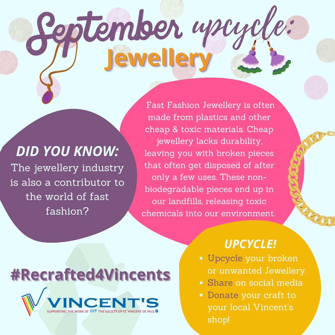 Did you know you can transform a plain photo frame with some old or broken jewellery? Join in with Vincent’s September upcycling event and help raise funds for their work as well as helping the planet! Share your images or videos of your crafted goods through social media #Recrafted4Vincents and then donate them to your local Vincent’s shop.